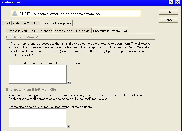 3. In the Preferences dialog, select the tab "Access & Delegation", then sub-tab "Shortcuts to Others' Mail".