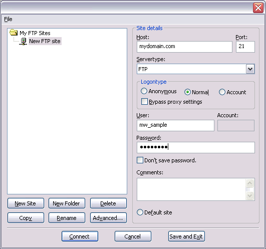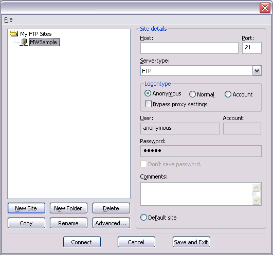 9. To use the new entry, highlight/click the new site just created, and then click Connect.
